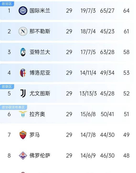 意甲第29轮全部比赛结束,尤文和拉齐奥在本轮遭遇失利,争四形势生变。原本排名第6的博洛尼亚一场大胜后成功跃居第4。当前意甲争夺前四位置的竞争异常激烈,经过本轮比赛,积分榜上的排名发生了明显变化,形成了六队争夺前四的局面,米兰距离前四仅差6分,争夺激烈。返回搜狐,查看更多
