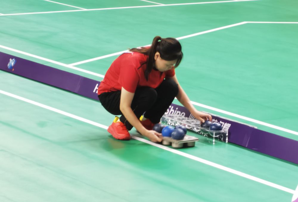 硬地滚球是最具包容性的残疾人运动之一,专门为脑瘫患者、严重躯体功能障碍的运动员而设立。其根据运动员残疾程度分为4个级别,杨贝贝属于其中较重的级别,无法独立掷球,因此需要轨道器械和竞赛辅助人员的帮助。